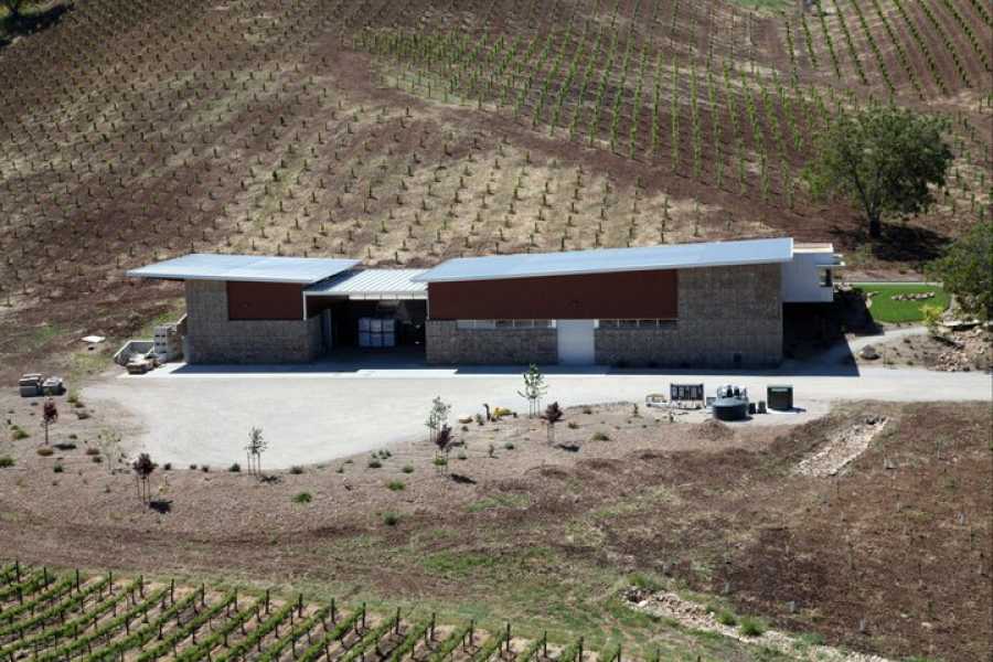 “The low-profile architecture of the family residence and winery take their cues from regional agricultural structures with the textural palate rooted in indigenous materials. Surfaces, hues and materials blend into the natural site patterns and reflect the seasonal changes. The gabion stone walls of the winery were sourced on site and reflect the dry farming process. The compound architecture of the residence encourages a dialogue with the immediate landscape, incorporating numerous exterior spaces, trellises and walkways between the various pods of the house.”