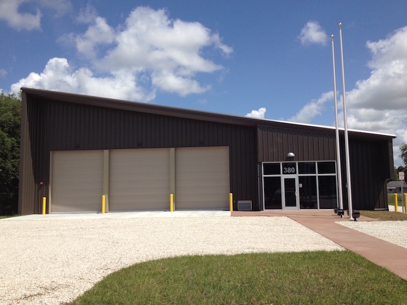 The Seminole Tribe of Florida contacted Allied Steel Buildings to provide a new facility for their Fire and Wildlife rescue team located on the outskirts of Lake Okeechobee. Architectural renderings were provided to Allied for design intent which were used by our engineering staff to give the building a contemporary design. The building includes a 5ft overhang and wall extensions on a single slope structure at both end walls. It also has a pop out entry feature with horizontal wall panel placement to match its unique design aesthetics.